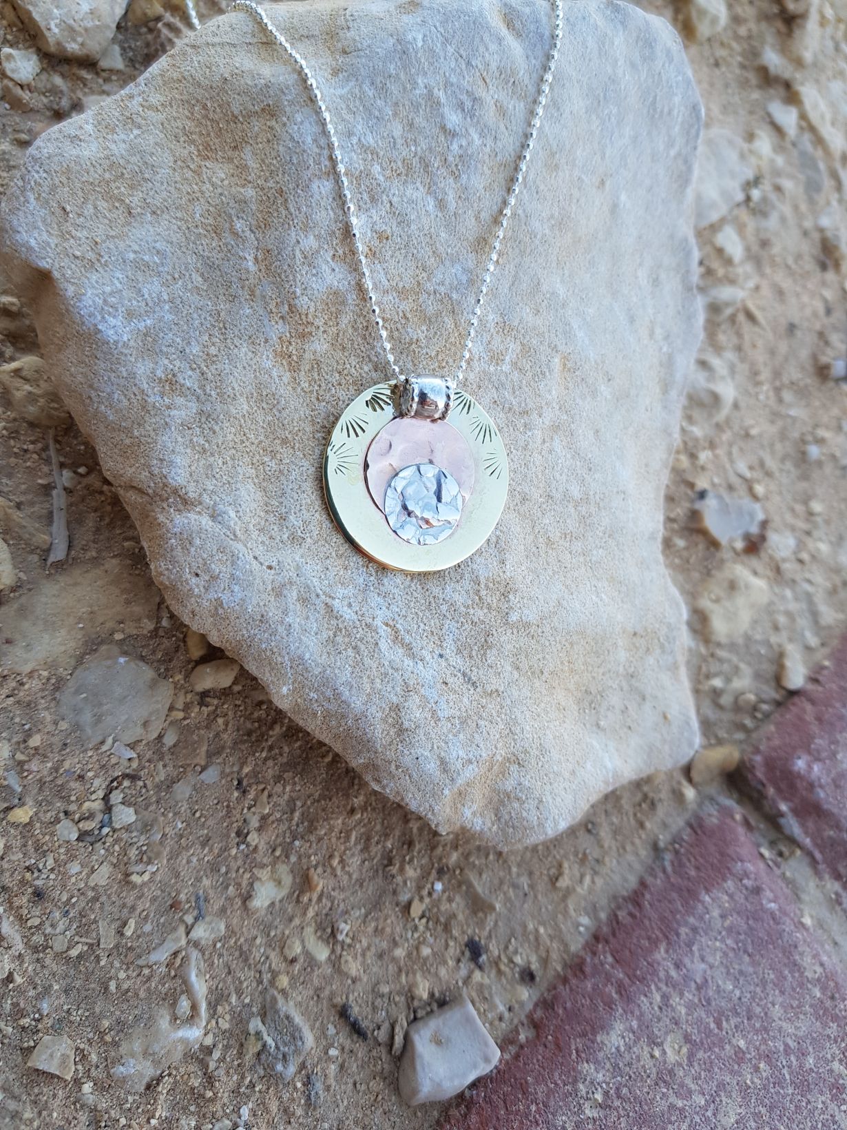 Maia Silver necklace with silver pendant and hammered round gold filled